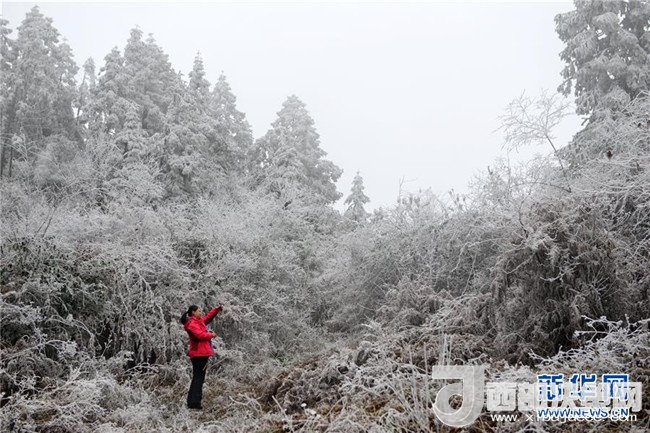 1月7日,一名游客在貴州省黔東南苗嶺國家地質公園拍攝霧凇景觀。寒冬時節(jié),位于貴州省黔東南州的苗嶺國家地質公園出現(xiàn)云海霧凇景觀,原始森林和草場在云海中若隱若現(xiàn),美若畫卷。(楊文斌攝)
