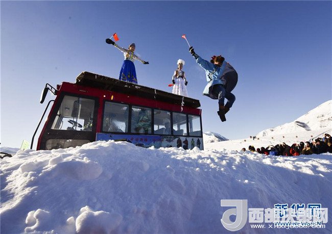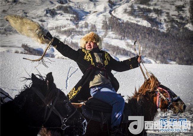 在新疆喀納斯禾木村舉辦的潑雪節(jié)上,當(dāng)?shù)鼐用裨跒橛慰捅硌萏?月1日攝)。記者 趙戈 攝