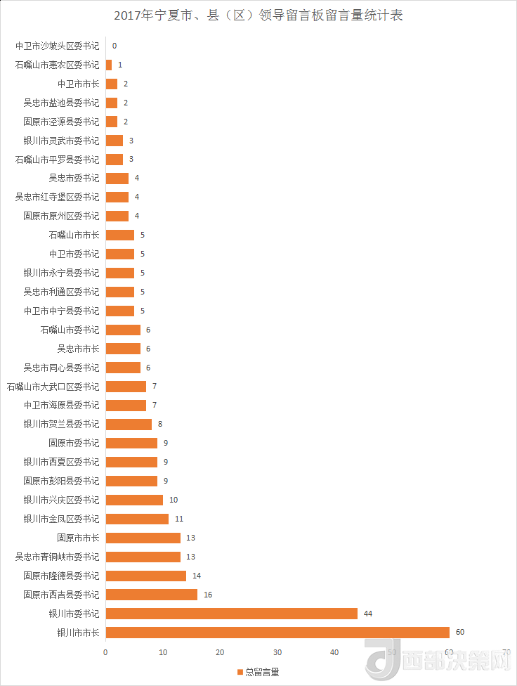 銀川市市長(zhǎng)、銀川市委書記、固原市西吉縣委書記的留言量分別以60、44、16條進(jìn)入前三名。盡管網(wǎng)民給固原市西吉縣委書記的留言量進(jìn)前三,但回復(fù)量卻為0。
