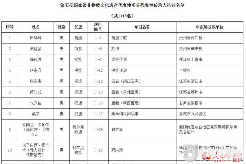 在各地推薦申報(bào)的基礎(chǔ)上,各評(píng)審組專家對(duì)全國(guó)31個(gè)省(區(qū)、市)、新疆生產(chǎn)建設(shè)兵團(tuán)、中央有關(guān)部門及港澳地區(qū)推薦的申報(bào)人進(jìn)行了評(píng)審,經(jīng)評(píng)審委員會(huì)審議,提出了第五批國(guó)家級(jí)非物質(zhì)文化遺產(chǎn)代表性項(xiàng)目代表性傳承人推薦名單(共1113人)。其中對(duì)尚未認(rèn)定過國(guó)家級(jí)代表性傳承人的項(xiàng)目,本次推薦827人,對(duì)已認(rèn)定過國(guó)家級(jí)代表性傳承人的項(xiàng)目,本次推薦286人。