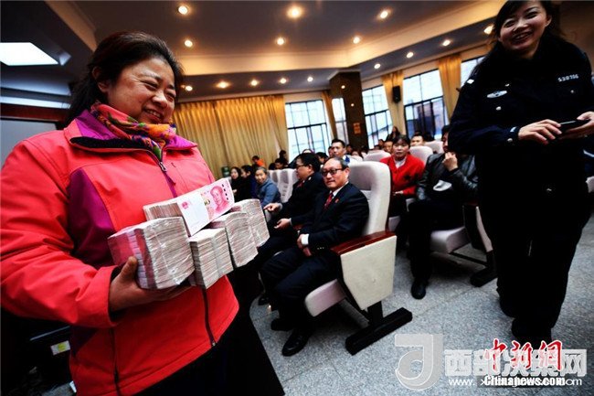 1月23日,發(fā)放現(xiàn)場滿臉笑容的市民抱著領(lǐng)到的現(xiàn)金。當(dāng)日,在2018年春節(jié)臨近之際,昆明市五華法院“法威行動(dòng)”執(zhí)行案款暨司法救助金集中發(fā)放在五華法院進(jìn)行。共對(duì)107件涉民生、涉金融案件發(fā)放執(zhí)行案款約5000萬元,同時(shí)對(duì)13起執(zhí)行案件中的14名特困人員發(fā)放司法救助金346000元。此次集中發(fā)放案款暨司法救助金大會(huì),旨在彰顯司法的權(quán)威和司法的人文關(guān)懷,確保申請執(zhí)行人和特困人員的合法權(quán)益得到及時(shí)兌現(xiàn),讓民眾過上一個(gè)歡樂祥和的新春佳節(jié)。記者李進(jìn)紅攝