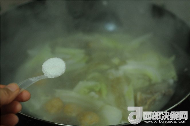 輔料:油 一勺 鹽 一撮 白菜葉 幾片 肉丸子 幾個 香菜 幾片