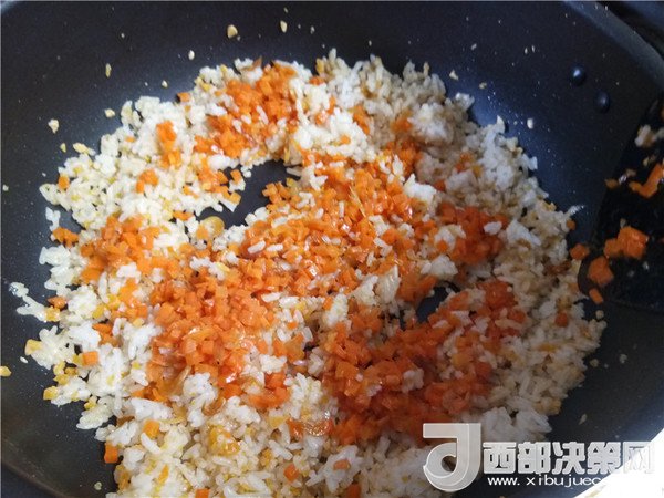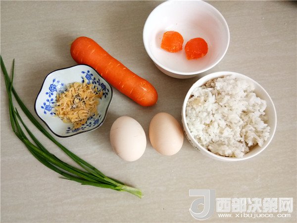 主料:米飯 1碗  咸蛋 2個(gè)  蝦皮 3克  胡蘿卜 80克  雞蛋 2個(gè)