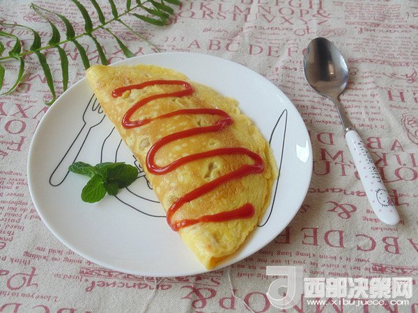 14.將炒好的飯倒入煎好蛋皮的一側(cè),另一邊折過(guò)來(lái)邊緣對(duì)齊。擠上番茄沙司裝飾即可開吃。