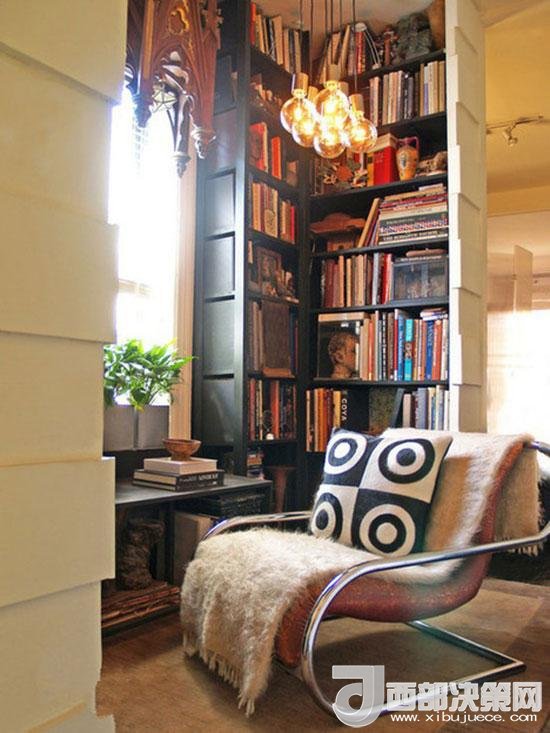 一個局促的轉角,被打造成了藏書空間,黑色的書架顯得厚重大氣,塞滿書本以后更有沉淀韻味。坐在舒適的躺椅上閱讀,體驗有滋有味的生活。