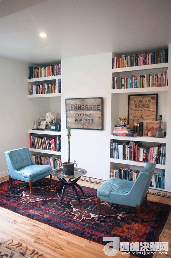 在墻面上掏出置物空間,讓書籍切切實實地成為家的一部分,左右對稱的設計十分美觀,旁邊的兩把單人沙發(fā)相對而坐,兩個人的書房要來得更加溫馨。