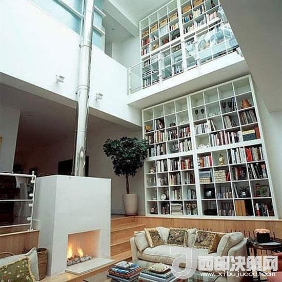 挑高的躍層空間,書架從上至下占據了兩層空間,顯得氣勢宏大,令人嘆服。