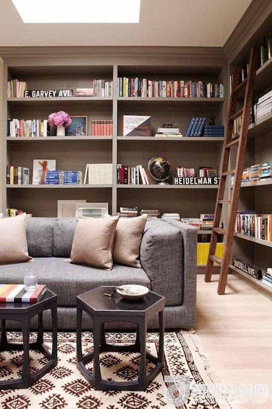 把全部的墻面都用來打造書架,用成摞的書本塞得滿滿當當,充實感油然而生。高處的書本也不怕夠不到,只要有一把梯子就能解決問題。
