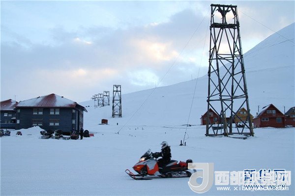 2月25日,在挪威斯瓦爾巴群島首府朗伊爾城,一輛雪地摩托車從已廢棄的運煤纜車架前駛過。新華社記者梁有昶攝