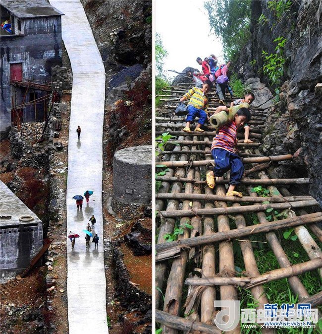 2012年9月3日,廣西大化瑤族自治縣板升鄉(xiāng)弄勇村弄頂屯的孩子們扛著生活用具去學(xué)校(右圖);2017年1月11日,水泥公路已經(jīng)從學(xué)校修通到家門口(左圖)。隨著脫貧攻堅(jiān)工作不斷推進(jìn),原本“千重山,萬層嶺,不通水,不通電”的廣西大石山區(qū)發(fā)生了翻天覆地的變化。記者黃孝邦攝