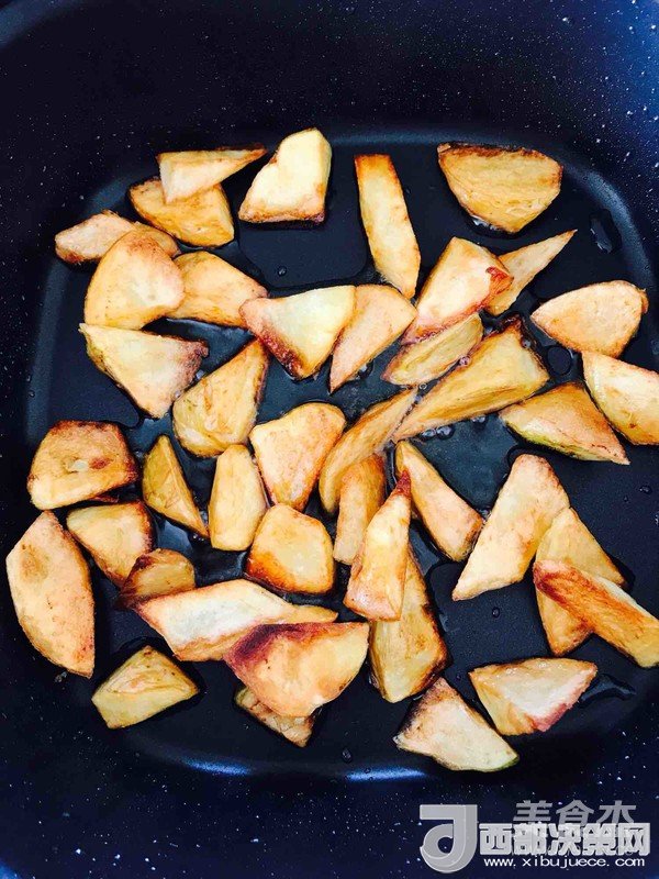 3.將土豆煎至金黃色,煎土豆的時(shí)候每面都要沾上油每面都要煎,要勤翻動(dòng)觀察上色情況