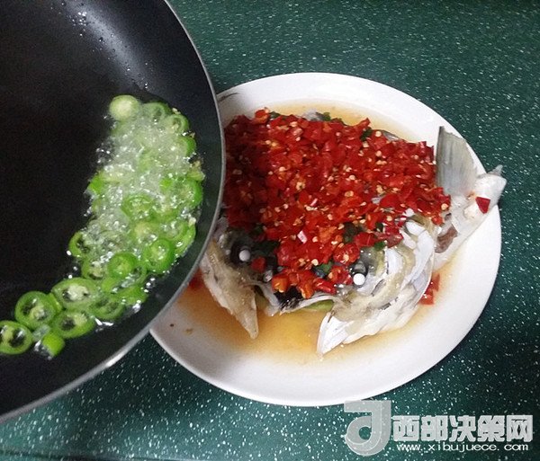 11.同時(shí)另起鍋燒熱油、下蔥花與杭椒爆香、然后趁熱淋在魚(yú)頭上