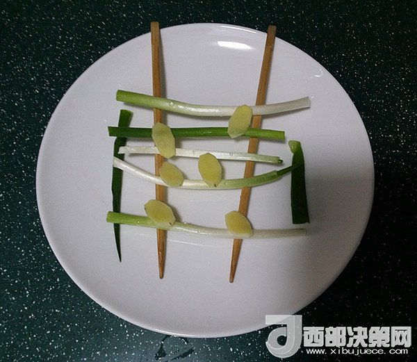 4.取一大盤(pán)子上面架起一雙筷子、放上洗凈的蔥段和姜片,也是達(dá)到去腥增香的作用