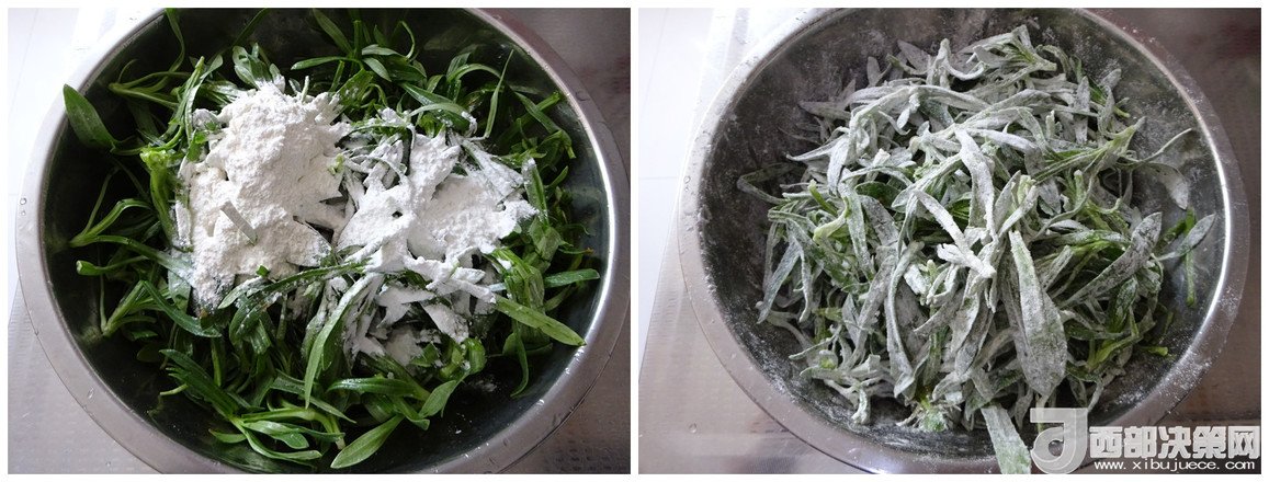 2.放入玉米淀粉和面粉,二者比例1:1,抓勻,使每片菜葉都裹上一層薄薄的粉,不用質(zhì)疑我為什么用一半的玉米淀粉,這樣做,蒸出來(lái)的菜口感好、顏色漂亮,不信您試試