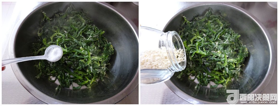 1.面條菜洗凈、控至不滴水,放入大盆中,淋入少許植物油抓勻,這樣可以防止粘連
