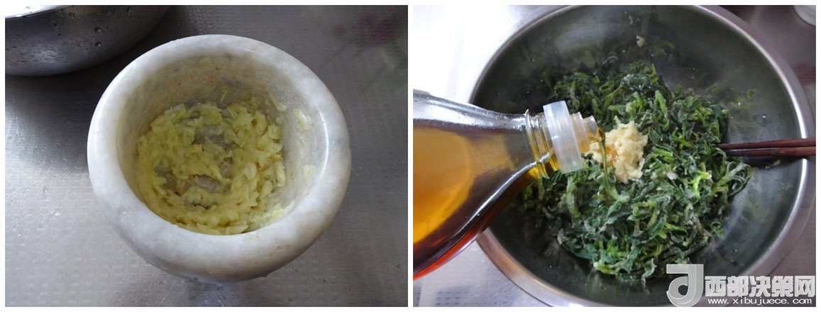 5.大蒜放一丟丟鹽搗成蒜泥,放入盆中,倒入適量的香油,拌勻即可,每到這個(gè)時(shí)候我就會(huì)開(kāi)始流口水了,香油和蒜泥混合后的香氣,太誘人了 記住,吃蒸菜必須放蒜泥,不然味道減一半哦