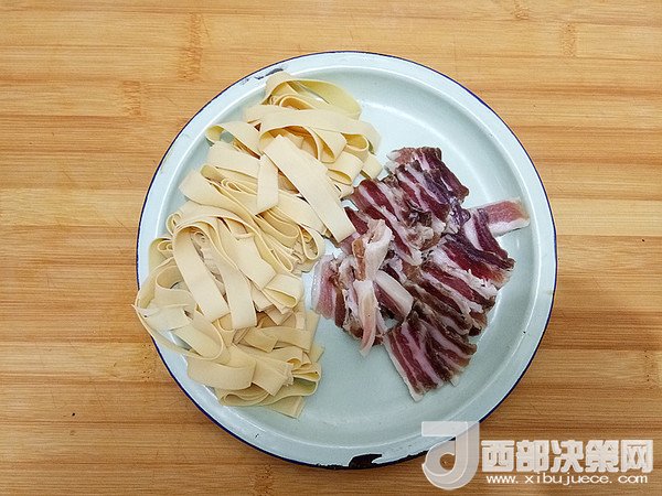 3.千張切寬一些的絲,咸肉用溫水浸泡一會,洗凈切薄片。