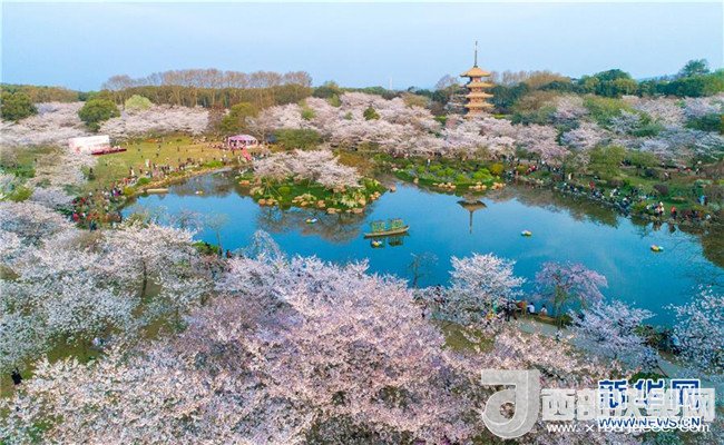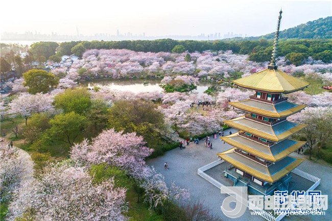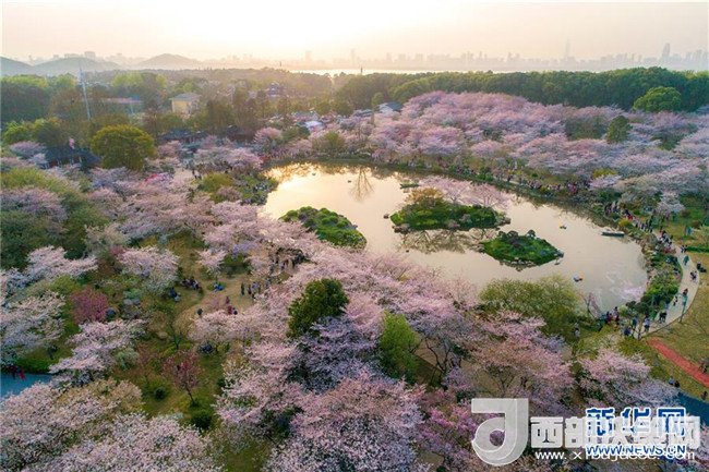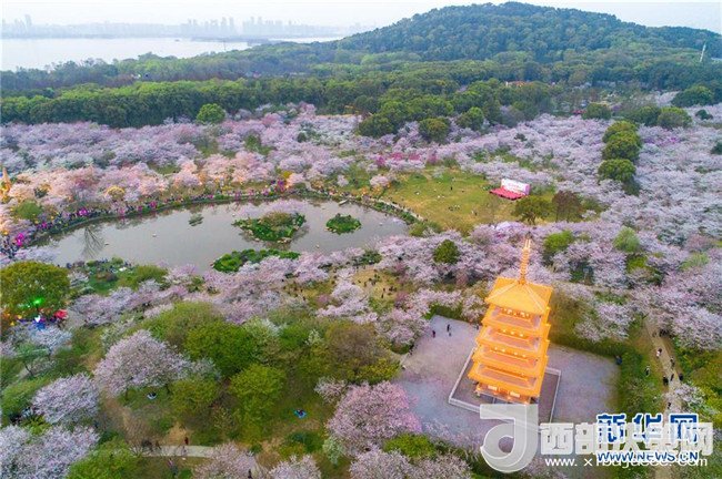 3月26日無(wú)人機(jī)拍攝的武漢東湖櫻花園。