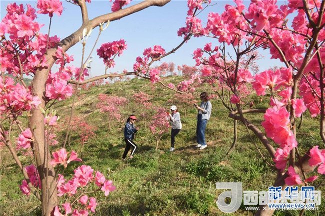 4月10日,游客在安徽銅陵鐘鳴鎮(zhèn)杜鵑山上賞花游玩。 新華社發(fā)(過(guò)仕寧 攝)