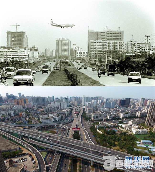 拼版照片為??谑袨I海大道今昔對(duì)比(上圖為1990年1月10日新華社記者姜恩宇攝,下圖為2018年4月15日新華社記者趙穎全攝)。