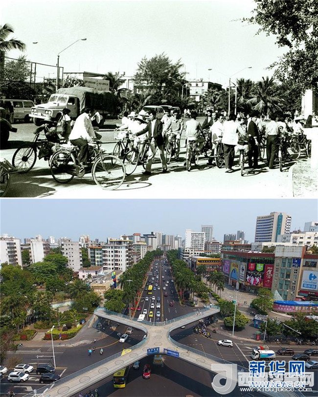拼版照片為海口市龍昆南路今昔對(duì)比(上圖為1993年6月30日新華社記者姜恩宇攝,下圖為2018年4月14日新華社記者郭程攝)。