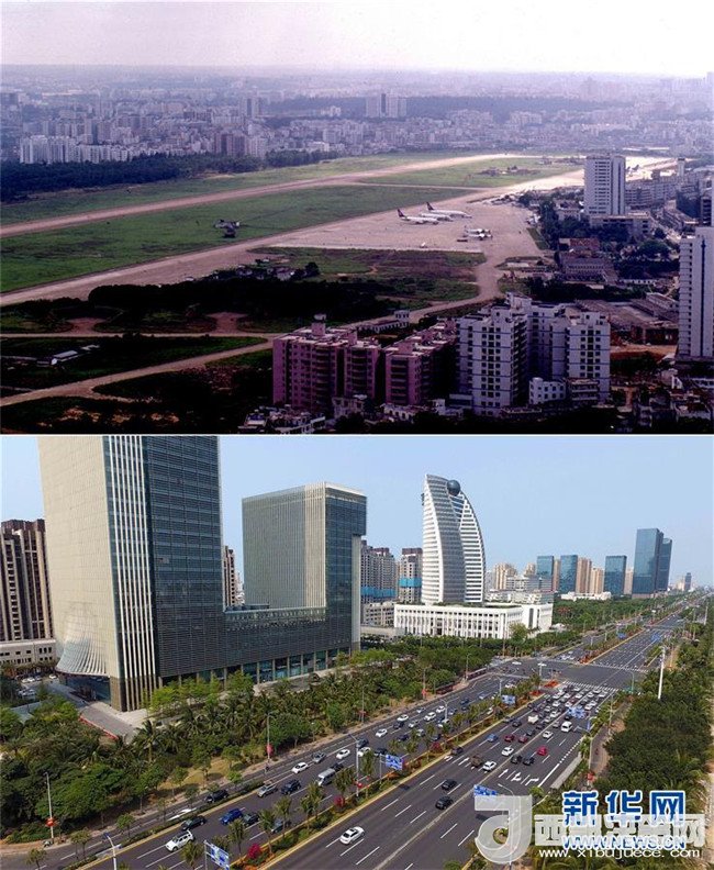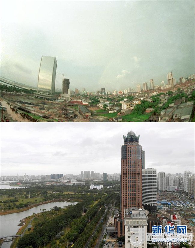 拼版照片為??谑泻8方裎魧?duì)比(上圖為1988年12月新華社記者姜恩宇攝,下圖為2018年4月14日新華社記者郭程攝)。