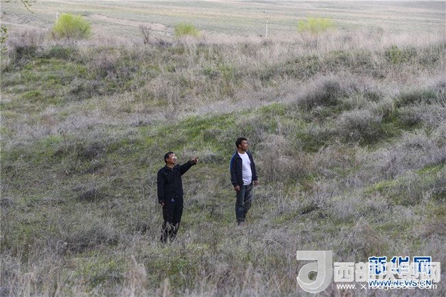新疆霍城四爪陸龜國(guó)家級(jí)自然保護(hù)區(qū)管理局工作人員林世忠(左)和護(hù)林員伊力扎提·伊麻木在保護(hù)區(qū)內(nèi)巡查(4月15日攝)。