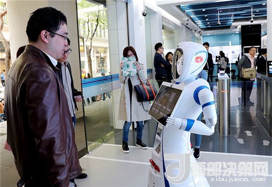 一位市民在位于上海九江路的無人銀行入口處向迎賓機器人說明需要辦理的業(yè)務種類(4月12日攝)。近日,中國建設銀行在上海九江路開出國內(nèi)首家無人銀行。新華社記者 方喆 攝