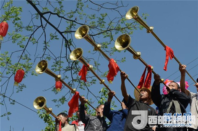 4月18日,在湖南省吉首市丹青鎮(zhèn)錦坪村,人們在“三月三”盛會(huì)上吹奏甲馬號(hào)。新華社發(fā)(姚方 攝)