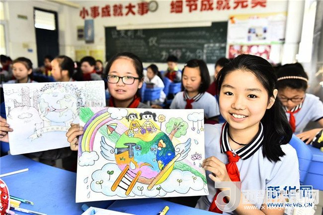 4月19日,安徽省合肥市蜀山區(qū)井崗鎮(zhèn)新城小學(xué)學(xué)生展示自己在“善待地球,童繪藍(lán)天——我與地球的故事”繪畫(huà)活動(dòng)中的作品。新華社發(fā)(葛宜年 攝)
