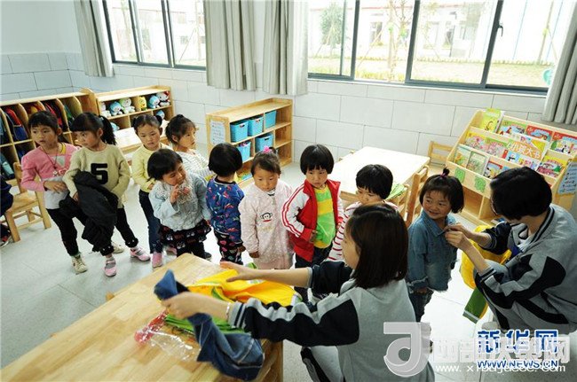 4月23日,吉雪(后排右)和小朋友們在新教室里吃早餐。