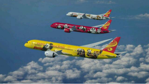 海南航空與夢工廠合作推出的三架“功夫熊貓”涂裝飛機(jī)翱翔藍(lán)天