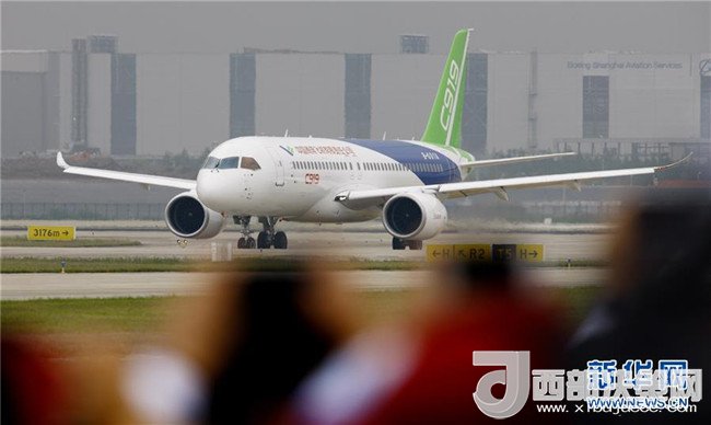 中國首款國際主流水準的干線客機C919在上海浦東國際機場首飛成功(2017年5月5日攝)。新華社記者方喆攝