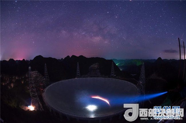 FAST在滿天繁星下呈現(xiàn)出的美麗景觀(2016年6月27日攝)。2017年10月10日,中國科學院國家天文臺宣布,被譽為“中國天眼”的500米口徑球面射電望遠鏡(FAST)經(jīng)過一年緊張調(diào)試,已實現(xiàn)指向、跟蹤、漂移掃描等多種觀測模式的順利運行,并確認了多顆新發(fā)現(xiàn)脈沖星。新華社記者劉續(xù)攝