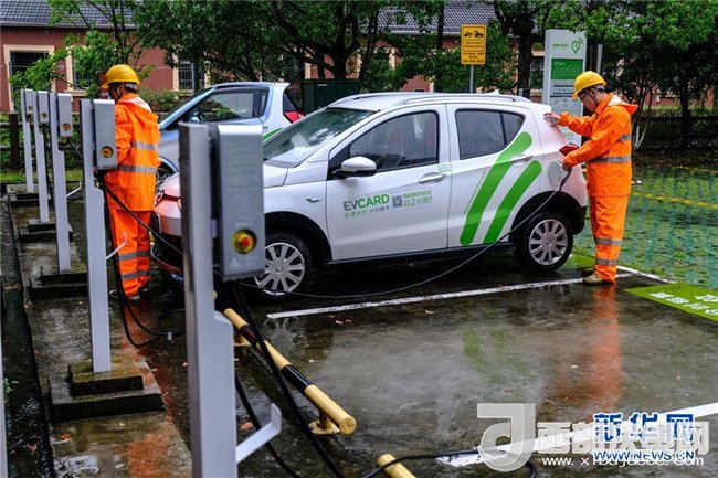 5月31日,工作人員在浙江省麗水市云和縣仙宮湖景區(qū)內(nèi)為電動(dòng)汽車充電。
