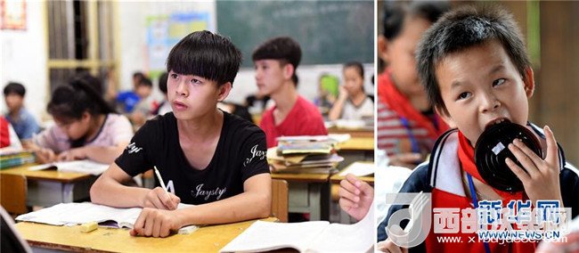 這是一張拼版圖片。左圖為2018年5月30日,在廣西三江侗族自治縣洋溪鄉(xiāng)中學,15歲的秦保軍在教室里上課;右圖為2014年6月10日,秦保軍在吊腳樓教室里吃愛心人士送來的節(jié)日蛋糕。