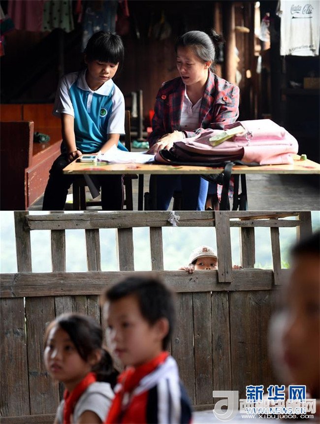 這是一張拼版圖片。上圖為2018年5月31日,在廣西三江侗族自治縣安馬村寨全屯,駐村工作隊員唐莉越入戶給10歲的彭桂花(左)輔導功課;下圖為2014年6月10日,即將入學的彭桂花在寨全教學點的吊腳樓教室外張望。