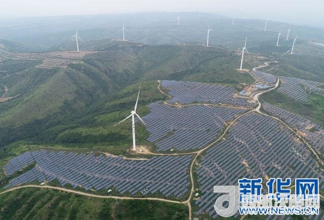 這是黃龍縣界頭廟鎮(zhèn)的風(fēng)力發(fā)電場(chǎng)和光伏發(fā)電項(xiàng)目(6月1日無(wú)人機(jī)拍攝)。新華社記者邵瑞攝