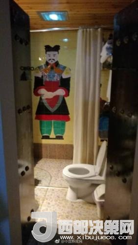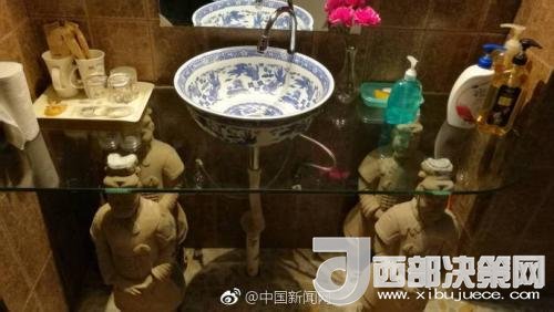 記者在網(wǎng)友曬出的圖片中看到,不僅衛(wèi)生間的墻壁上有兵馬俑的圖案,洗手臺也由四個俑“頂”著。