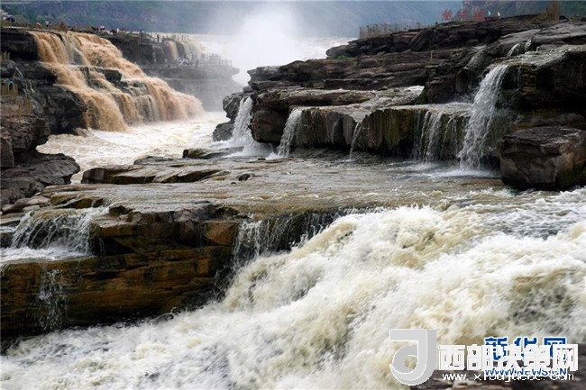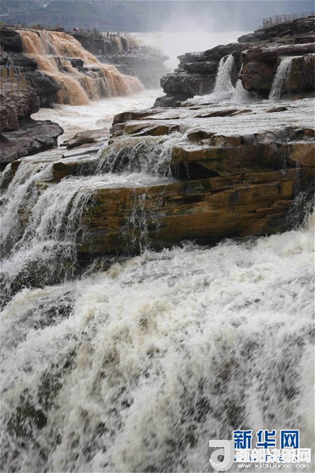 近日,受上游局部地區(qū)強降雨影響,黃河壺口瀑布出現(xiàn)西邊濁浪翻滾、東邊白浪滔滔的奇特景觀,吸引了眾多游客前來觀看。 新華社發(fā)(呂桂明 攝)