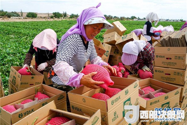 6月27日,新疆哈密市伊州區(qū)南湖鄉(xiāng)瓜農(nóng)把包裝好的哈密瓜裝箱。