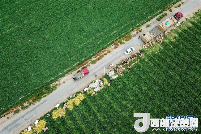 6月27日,新疆哈密市伊州區(qū)南湖鄉(xiāng)瓜農(nóng)將采摘的哈密瓜堆放在地頭,準(zhǔn)備裝車外運(yùn)(無人機(jī)拍攝)。