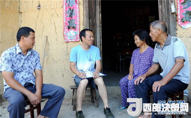 在江西永新縣三灣鄉(xiāng)三灣村,邢鐳(左二)在74歲的村民段老金家里了解土坯房改造情況(2013年8月10日攝)。邢鐳來自湖北,在三灣鄉(xiāng)扎根9年,2017年他剛剛帶領(lǐng)三灣鄉(xiāng)脫貧摘帽。新華社記者 周科 攝