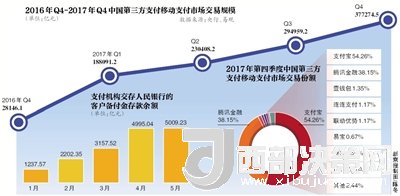 在移動支付市場上,支付寶和擁有財(cái)付通、微信支付的騰訊金融雙寡頭局勢顯現(xiàn)。今年4月,易觀2017年第四季度中國第三方支付移動支付市場數(shù)據(jù)顯示,第三方移動支付市場交易規(guī)模為37.7萬億元,環(huán)比增長27.91%。其間支付寶和騰訊金融兩巨頭的份額分別為54.26%和38.15%,合計(jì)92.41%。