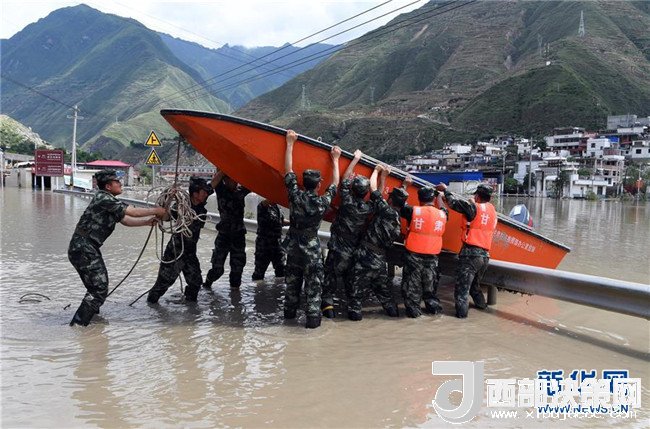 7月15日,在舟曲縣南峪鄉(xiāng),武警甘南支隊?wèi)?zhàn)士在搬運(yùn)沖鋒舟。