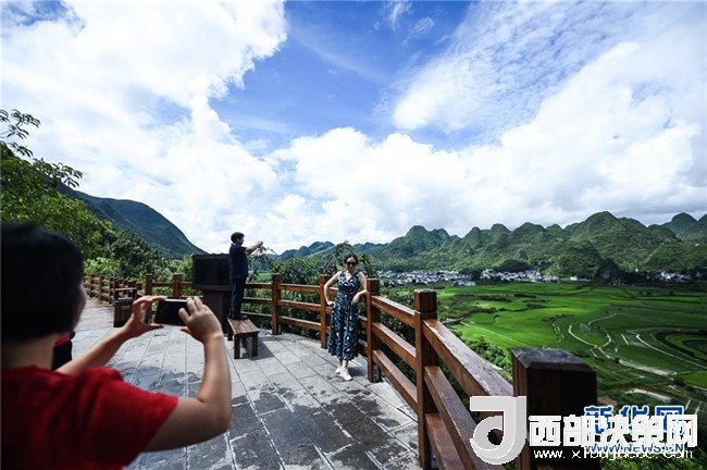 游客在萬峰林景區(qū)拍照留念(7月15日攝)。