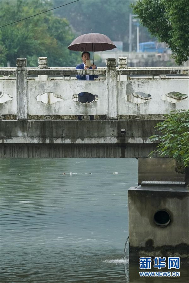 在江蘇省無錫市濱湖區(qū)馬山街道西村社區(qū),顧家瀆河河長鈕建春在巡查村中河道時拍攝雨水出水口情況(2017年10月12日攝)。