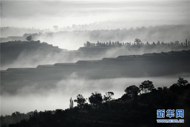 近日,寧夏固原市彭陽縣數(shù)十萬畝旱作梯田在曙光中迎來云海景觀,層疊的梯田間云霧繚繞,宛如仙境。據(jù)了解,彭陽縣自1983年建縣以來,始終堅持生態(tài)立縣的理念,積極推進(jìn)植樹造林事業(yè),全縣林木保存面積由1983年的27萬畝,增長到目前的203.87萬畝,森林覆蓋率達(dá)到27.5%。記者王鵬攝