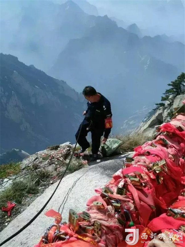 1979年出生的馮凱是華山景區(qū)負(fù)責(zé)蒼龍嶺段的一名安保員。這條長300米的責(zé)任路段,是華山最為險(xiǎn)峻的地勢之一。單行,游客只能朝上攀爬;狹窄,臺(tái)階不足一米寬;陡峭,需要手腳并用,極為消耗體力。年紀(jì)稍大的游客腿腳不靈活,馮凱迅速上前攙扶;年幼的孩子走不動(dòng)了,哭鬧不止,馮凱幫助孩子家長,帶著一家人順利通過;小姑娘爬山爬累了,坐在臺(tái)階上休息,馮凱要第一時(shí)間勸導(dǎo)她到云海平臺(tái)安全處再休息;有些游客喜歡在奇險(xiǎn)處擺各種姿勢拍照,馮凱也要耐心細(xì)致地保護(hù)周全,以防意外,同時(shí)疏導(dǎo)人群,防止踩踏。遇到游客吸煙,馮凱要及時(shí)制止,耐心解釋。不間斷地巡查,馮凱是為了檢查鐵欄桿是否松動(dòng),臺(tái)階是否有破損,安全標(biāo)識(shí)是否完整。為了能第一時(shí)間出現(xiàn)在游客的身邊,300米的距離,馮凱得上上下下,走來走去幾十遍。這些都是馮凱的工作,而馮凱的工作內(nèi)容卻不僅僅是這些。