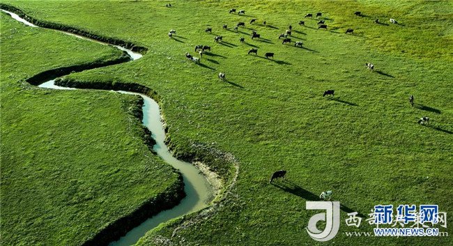 8月22日,牛群在廣靈縣壺流河濕地覓食(無人機拍攝)。新華社發(fā)(李濤 攝)
